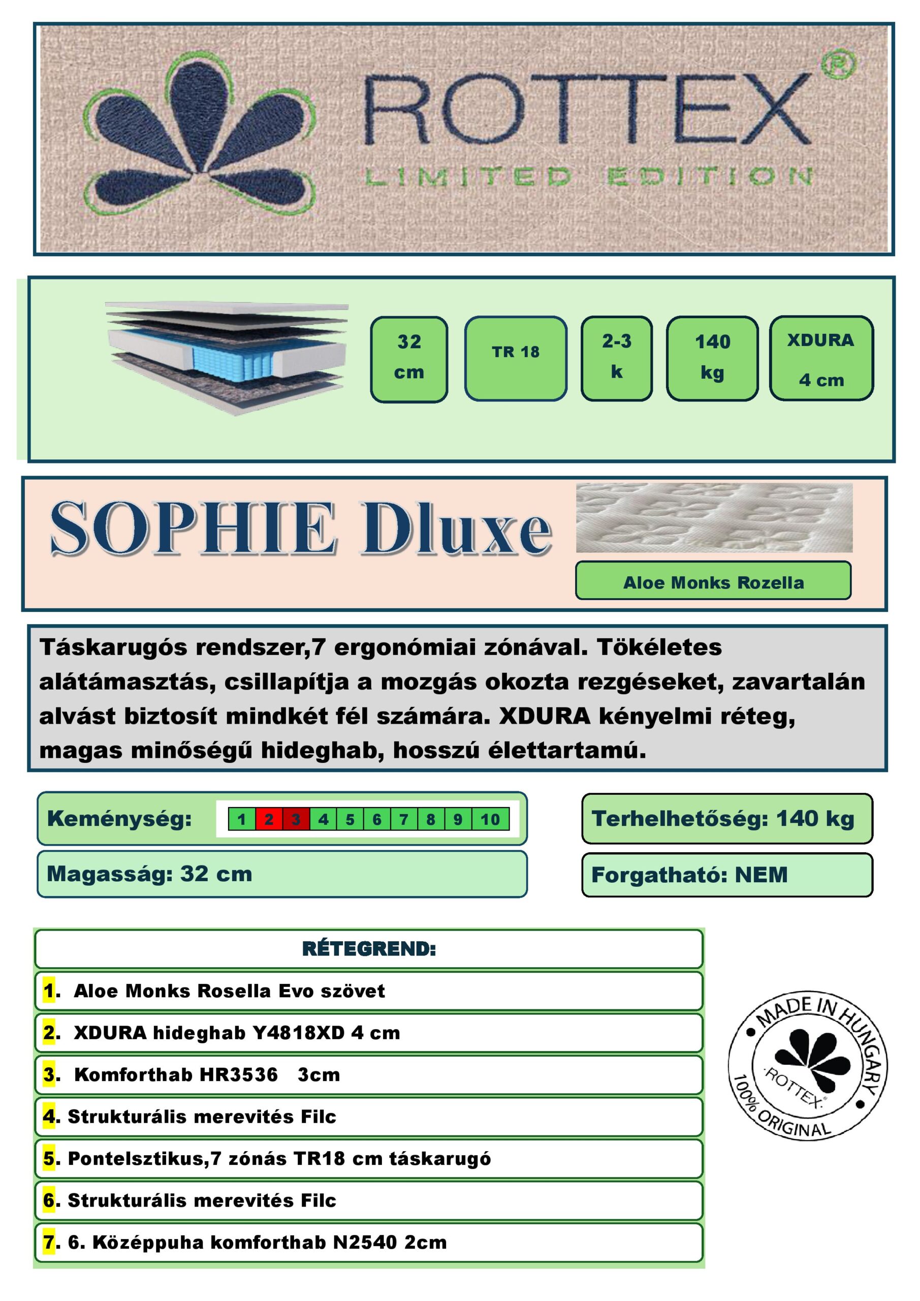 A Sophie Dluxe táskarugós matrac rendszer, 7 ergonómiai zónával. Tökéletes alátámasztás, csillapítja a mozgás okozta rezgéseket, zavartalan alvást biztosít mindkét fél számára.A foam.hybrid XDURA kényelmi réteg rendkívüli robusztusság és hosszú éllettartam biztosit. A puha komfortot keresőknek.